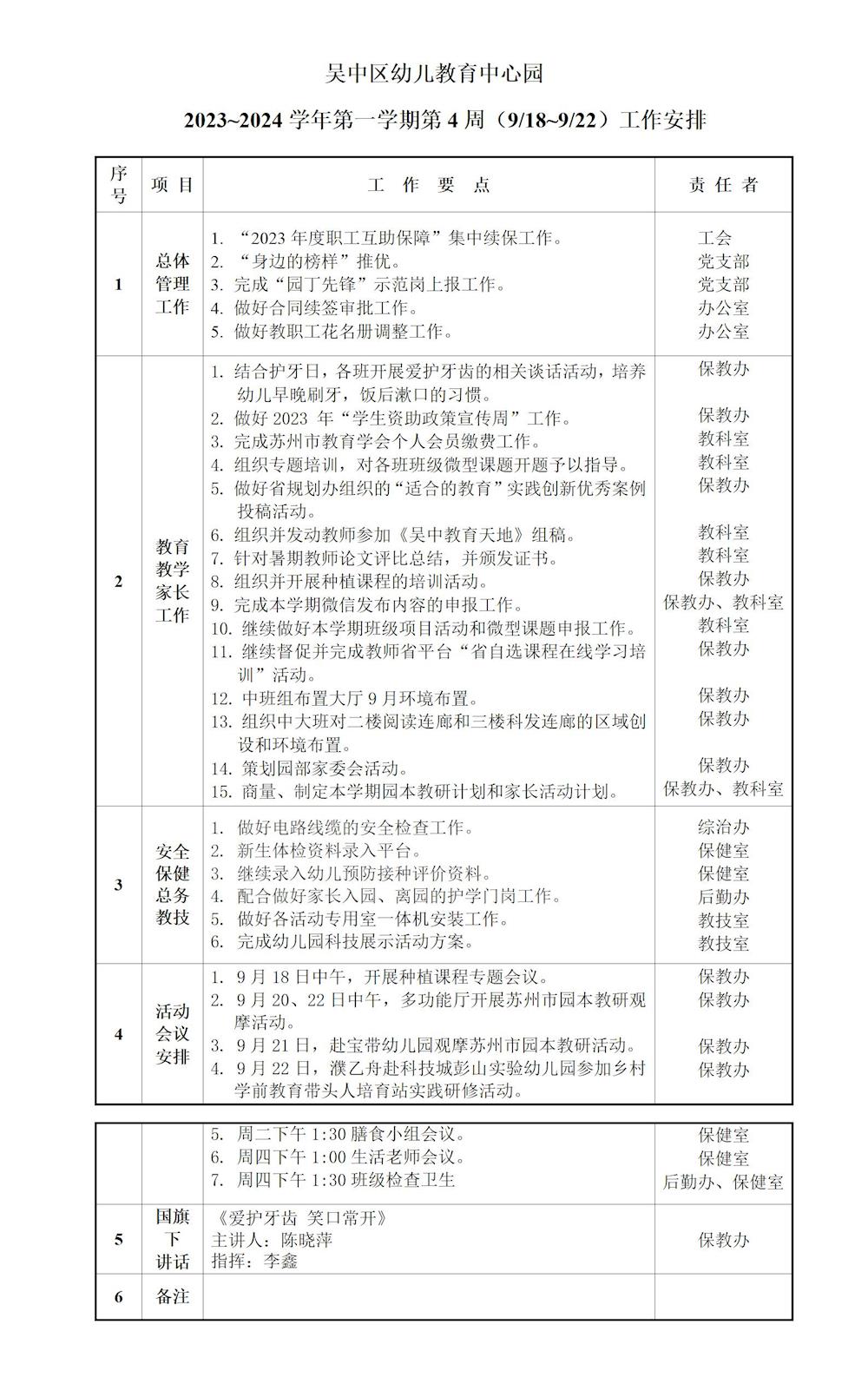 吴中区幼儿教育中心园2023~2024学年度第一学期第4周(9/18~9/22)工作安排