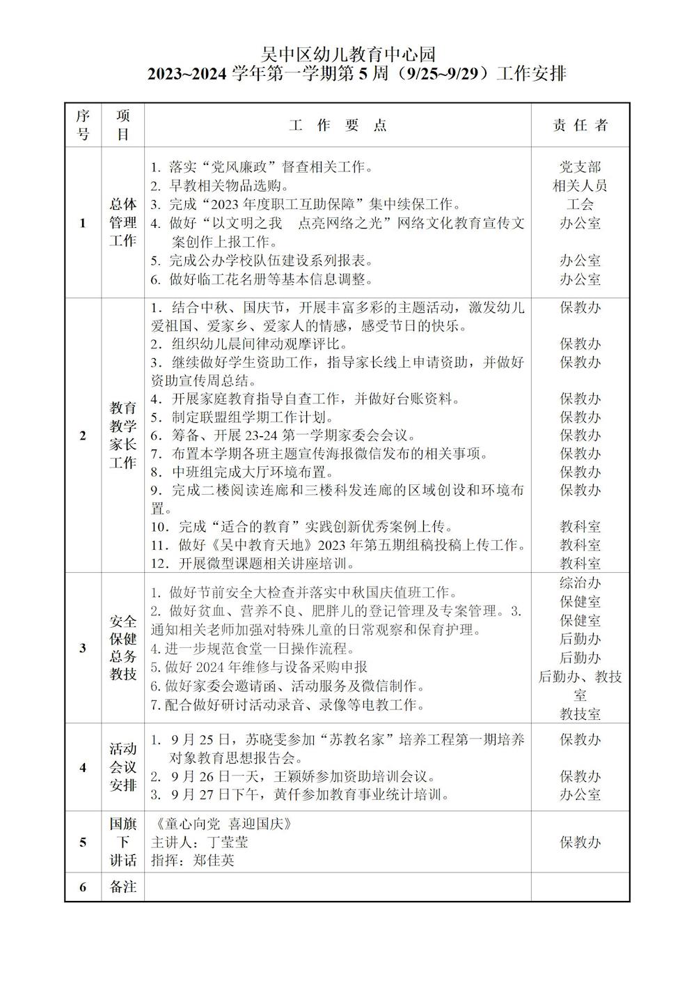 吴中区幼儿教育中心园2023~2024学年度第一学期第5周(9/25~9/29)工作安排